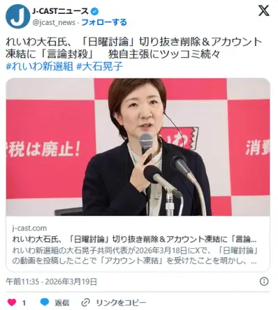 れいわ大石「日曜討論に出たから見て見て」→著作権侵害でアカウント凍結され発狂