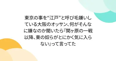 東京の事を“江戸”と呼び毛嫌いしている大阪のオッサン、何がそんなに嫌なのか聞いたら『関ヶ原の一戦以降、東の奴らがとにかく気に入らない』って言ってた
