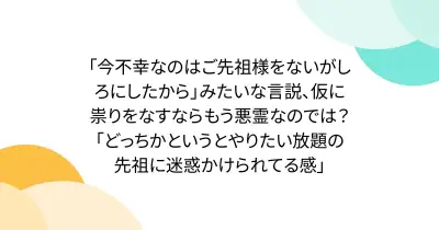 「今不幸なのはご先祖様をないがしろにしたから」みたいな言説、仮に祟りをなすならもう悪霊なのでは?「どっちかというとやりたい放題の先祖に迷惑かけられてる感」