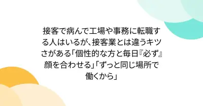 接客で病んで工場や事務に転職する人はいるが、接客業とは違うキツさがある「個性的な方と毎日『必ず』顔を合わせる」「ずっと同じ場所で働くから」