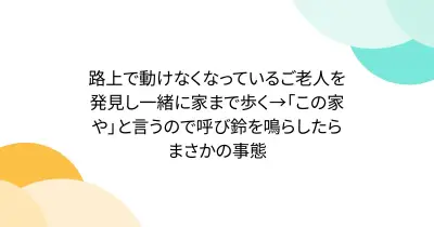 路上で動けなくなっているご老人を発見し一緒に家まで歩く→「この家や」と言うので呼び鈴を鳴らしたらまさかの事態