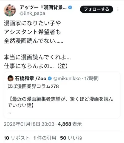 漫画家「最近の漫画家志望、アシスタント、編集者志望、驚くほど漫画を読んでいない、まじで読め 仕事にならん」