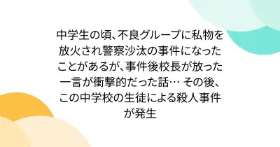 中学生の頃、不良グループに私物を放火され警察沙汰の事件になったことがあるが、事件後校長が放った一言が衝撃的だった話… その後、この中学校の生徒による殺人事件が発生