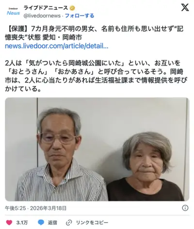 自分の名前も住所も思い出せない…身元不明の男女 2人とも記憶喪失状態 情報提供呼びかけ