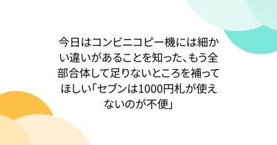 今日はコンビニコピー機には細かい違いがあることを知った、もう全部合体して足りないところを補ってほしい「セブンは1000円札が使えないのが不便」