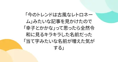 「今のトレンドは古風なレトロネーム」みたいな記事を見かけたので「幸子とかかな」って思ったら全然令和に見るキラキラした名前だった「当て字みたいな名前が増えた気がする」