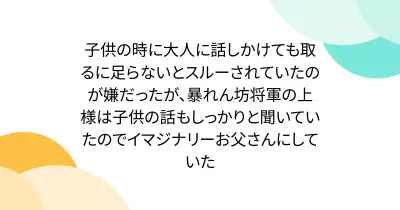 子供の時に大人に話しかけても取るに足らないとスルーされていたのが嫌だったが、暴れん坊将軍の上様は子供の話もしっかりと聞いていたのでイマジナリーお父さんにしていた