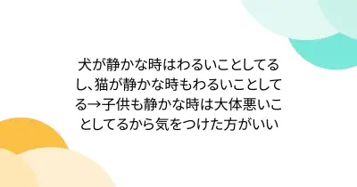 犬が静かな時はわるいことしてるし、猫が静かな時もわるいことしてる→子供も静かな時は大体悪いことしてるから気をつけた方がいい