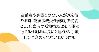 高齢者や身寄りのない人が家を借りる時「死後事務委任契約」を特約とし、死亡時の残地物処理を円滑に行える仕組みは良いと思うが、手放しでは褒められないという声も