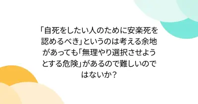 「自死をしたい人のために安楽死を認めるべき」というのは考える余地があっても「無理やり選択させようとする危険」があるので難しいのではないか?