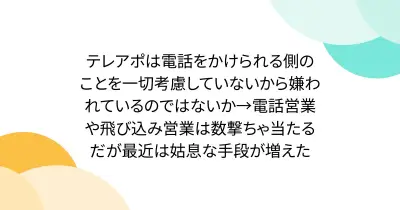 テレアポは電話をかけられる側のことを一切考慮していないから嫌われているのではないか→電話営業や飛び込み営業は数撃ちゃ当たるだが最近は姑息な手段が増えた