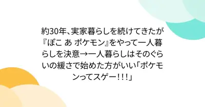 約30年、実家暮らしを続けてきたが 『ぽこ あ ポケモン』をやって一人暮らしを決意→一人暮らしはそのぐらいの緩さで始めた方がいい「ポケモンってスゲー!!!」
