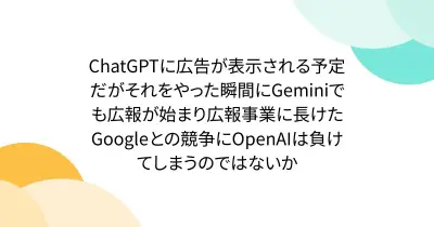 ChatGPTに広告が表示される予定だがそれをやった瞬間にGeminiでも広報が始まり広報事業に長けたGoogleとの競争にOpenAIは負けてしまうのではないか