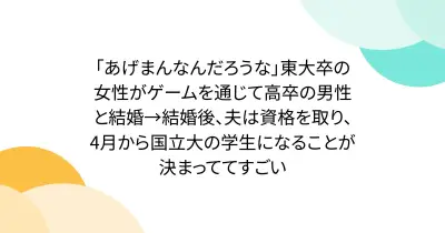 「あげまんなんだろうな」東大卒の女性がゲームを通じて高卒の男性と結婚→結婚後、夫は資格を取り、4月から国立大の学生になることが決まっててすごい