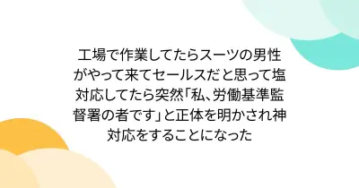 工場で作業してたらスーツの男性がやって来てセールスだと思って塩対応してたら突然「私、労働基準監督署の者です」と正体を明かされ神対応をすることになった