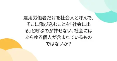 雇用労働者だけを社会人と呼んで、そこに飛び込むことを「社会に出る」と呼ぶのが許せない、社会にはあらゆる個人が含まれているものではないか?