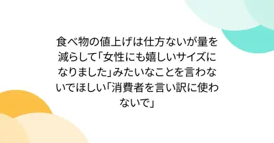 食べ物の値上げは仕方ないが量を減らして「女性にも嬉しいサイズになりました」みたいなことを言わないでほしい「消費者を言い訳に使わないで」