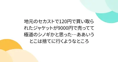 地元のセカストで120円で買い取られたジャケットが9000円で売ってて極道のシノギかと思った…ああいうとこは捨てに行くようなところ