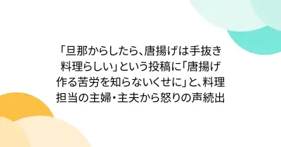 「旦那からしたら、唐揚げは手抜き料理らしい」という投稿に「唐揚げ作る苦労を知らないくせに」と、料理担当の主婦・主夫から怒りの声続出