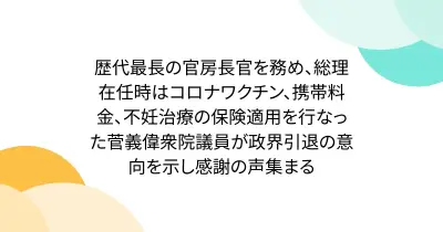 歴代最長の官房長官を務め、総理在任時はコロナワクチン、携帯料金、不妊治療の保険適用を行なった菅義偉衆院議員が政界引退の意向を示し感謝の声集まる