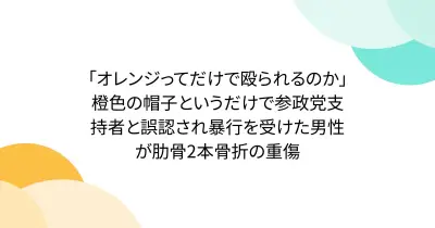 「オレンジってだけで殴られるのか」橙色の帽子というだけで参政党支持者と誤認され暴行を受けた男性が肋骨2本骨折の重傷