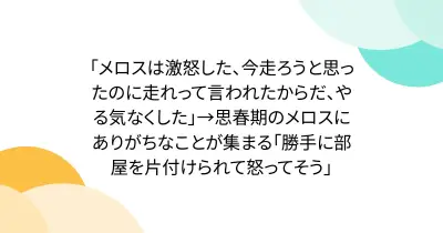 「メロスは激怒した、今走ろうと思ったのに走れって言われたからだ、やる気なくした」→思春期のメロスにありがちなことが集まる「勝手に部屋を片付けられて怒ってそう」