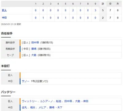 【試合結果】 3/31 中日 2-5 巨人 好投金丸6回に捕まり同点に 9回藤嶋が勝ち越し許し開幕4連敗