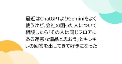 最近はChatGPTよりGeminiをよく使うけど、会社の困った人について相談したら「その人は同じフロアにある迷惑な備品と思おう」とキレキレの回答を出してきて好きになった
