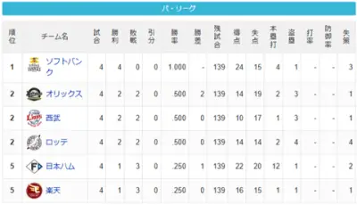 【3/31】パ・リーグ順位表|ホーム開幕戦勝利…日ハムの現在順位がこちら
