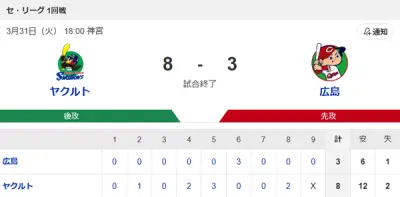 【試合結果】ヤクルト8-3広島 開幕4連勝!小川無失点!増田1号2ラン!
