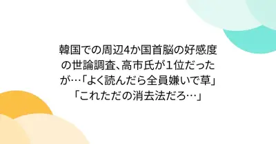 韓国での周辺4か国首脳の好感度の世論調査、高市氏が1位だったが…「よく読んだら全員嫌いで草」「これただの消去法だろ…」