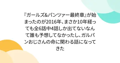 『ガールズ&パンツァー最終章』が始まったのが2016年、まさか10年経っても全6話中4話しか出てないなんて誰も予想してなかったし、ガルパンおじさんの命に関わる話になってきた