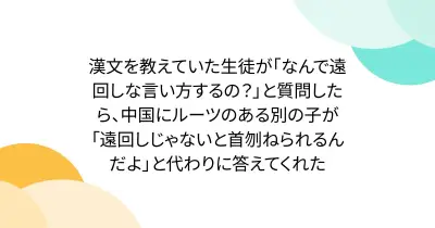 漢文を教えていた生徒が「なんで遠回しな言い方するの?」と質問したら、中国にルーツのある別の子が「遠回しじゃないと首刎ねられるんだよ」と代わりに答えてくれた