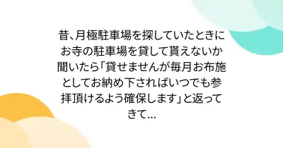 昔、月極駐車場を探していたときにお寺の駐車場を貸して貰えないか聞いたら「貸せませんが毎月お布施としてお納め下さればいつでも参拝頂けるよう確保します」と返ってきて...