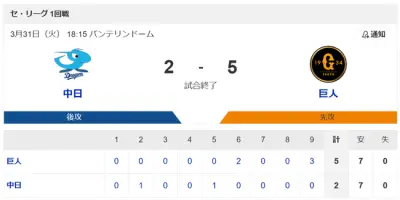 【中日対巨人1回戦】巨人が中日に逆転勝ち! 同点の9回、代打・丸が走者一掃二塁打 昇格初日の大勢が初セーブ!中日は開幕4連敗