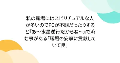 私の職場にはスピリチュアルな人が多いのでPCが不調だったりすると『あ~水星逆行だからね~』で済む事がある「職場の安寧に貢献していて良」