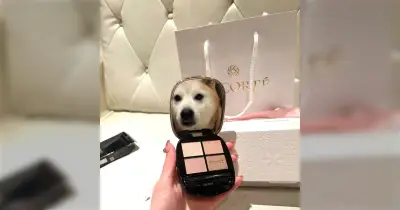 コスメデコルテのアイシャドウの写真を撮ろうとしたら愛犬が鏡に映り込んできてかわいさがしんどい「この雰囲気で渋めの柴犬なのがいい」