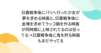 日露戦争後にパリへ行った少女が夢を求める映画と、日露戦争後に金塊を求めてラッコ鍋を作る映画が同時期に上映されてるのは狂ってる→日露戦争後に鬼を狩る映画もまだやってる