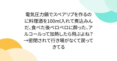 電気圧力鍋でスペアリブを作るのに料理酒を100ml入れて煮込みんだ、食べた後ベロベロに酔った、アルコールって加熱したら飛ぶよね?→密閉されて行き場がなくて戻ってきてる