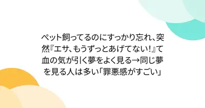 ぺット飼ってるのにすっかり忘れ、突然『エサ、もうずっとあげてない!』て血の気が引く夢をよく見る→同じ夢を見る人は多い「罪悪感がすごい」