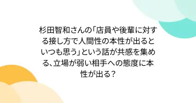 杉田智和さんの「店員や後輩に対する接し方で人間性の本性が出るといつも思う」という話が共感を集める、立場が弱い相手への態度に本性が出る?