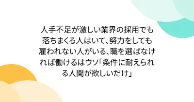 人手不足が激しい業界の採用でも落ちまくる人はいて、努力をしても雇われない人がいる、職を選ばなければ働けるはウソ「条件に耐えられる人間が欲しいだけ」