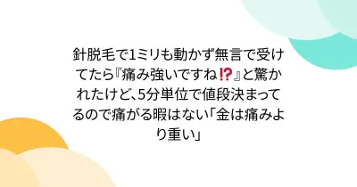 針脱毛で1ミリも動かず無言で受けてたら『痛み強いですね⁉』と驚かれたけど、5分単位で値段決まってるので痛がる暇はない「金は痛みより重い」