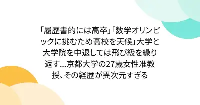「履歴書的には高卒」「数学オリンピックに挑むため高校を天候」大学と大学院を中退しては飛び級を繰り返す...京都大学の27歳女性准教授、その経歴が異次元すぎる