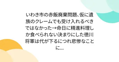 いわき市の赤飯廃棄問題、仮に遺族のクレームでも受け入れるべきではなかった→命日に精進料理しか食べられない決まりにした徳川将軍は代が下るにつれ悲惨なことに...
