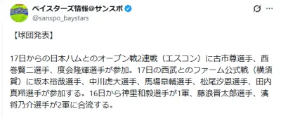 DeNA 16日から神里が1軍合流し、藤浪と濱が2軍合流 17日からのエスコン日ハム戦に古市、西巻、度会が参加