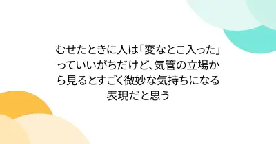 むせたときに人は「変なとこ入った」っていいがちだけど、気管の立場から見るとすごく微妙な気持ちになる表現だと思う
