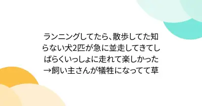 ランニングしてたら、散歩してた知らない犬2匹が急に並走してきてしばらくいっしょに走れて楽しかった→飼い主さんが犠牲になってて草