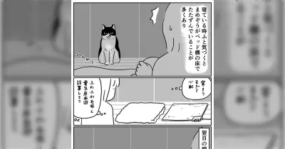 17歳の猫が早朝にベッド横の床に佇んでいることがあり、寒さを心配してあれこれ設置した翌朝…「猫はほんとこれ」
