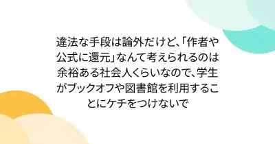 違法な手段は論外だけど、「作者や公式に還元」なんて考えられるのは余裕ある社会人くらいなので、学生がブックオフや図書館を利用することにケチをつけないで